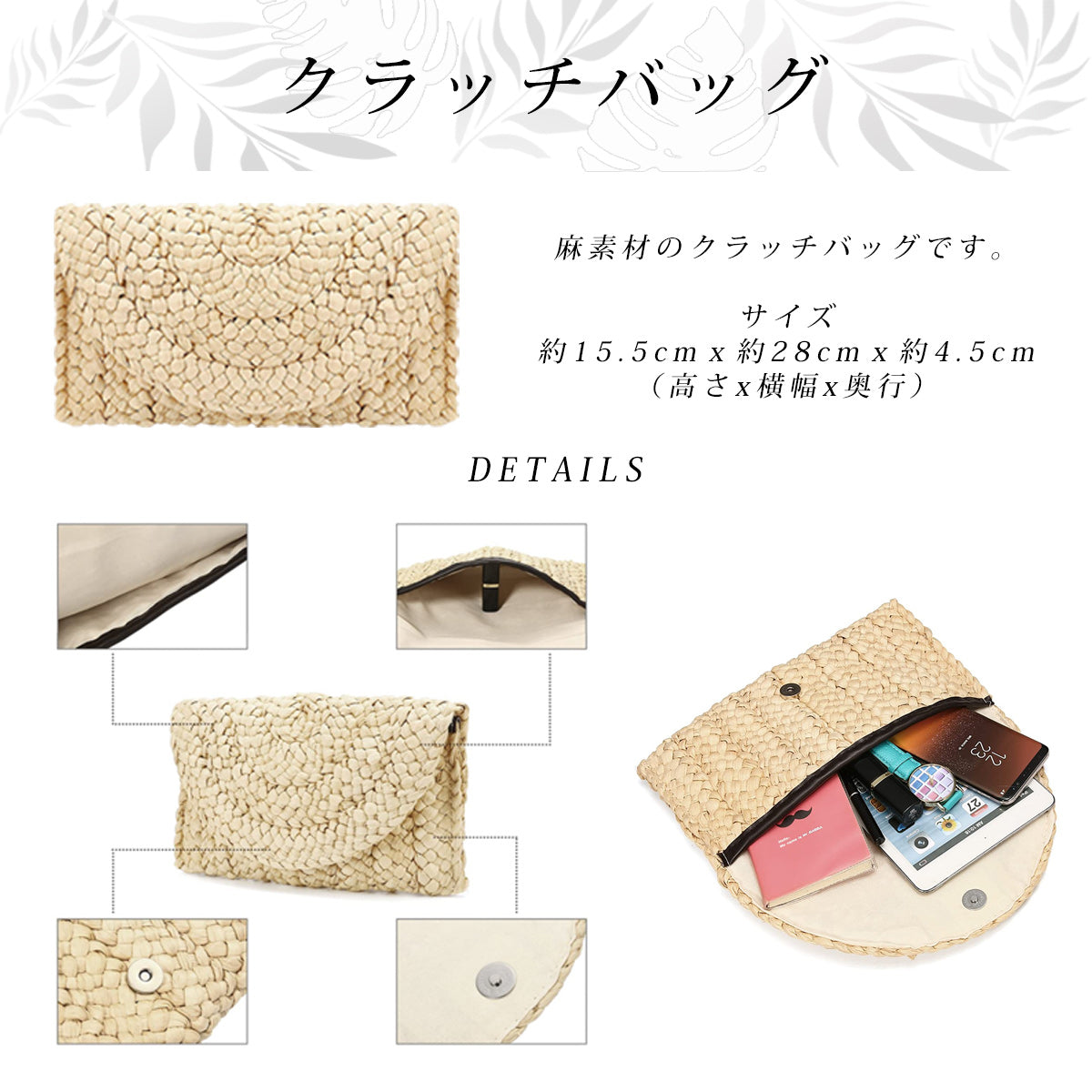 This is a linen clutch bag that can hold the bare necessities such as a smartphone, handkerchief, and a gift envelope.