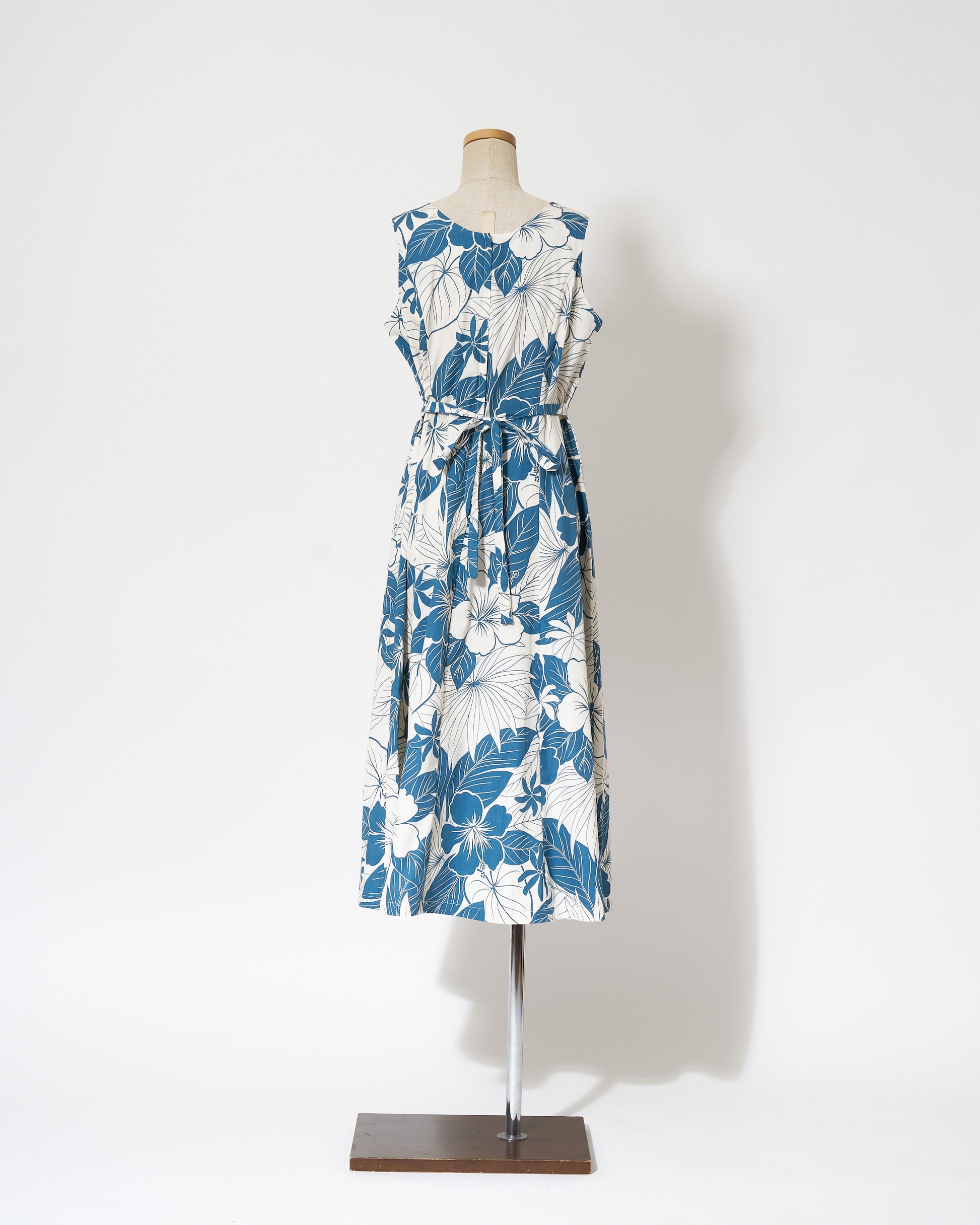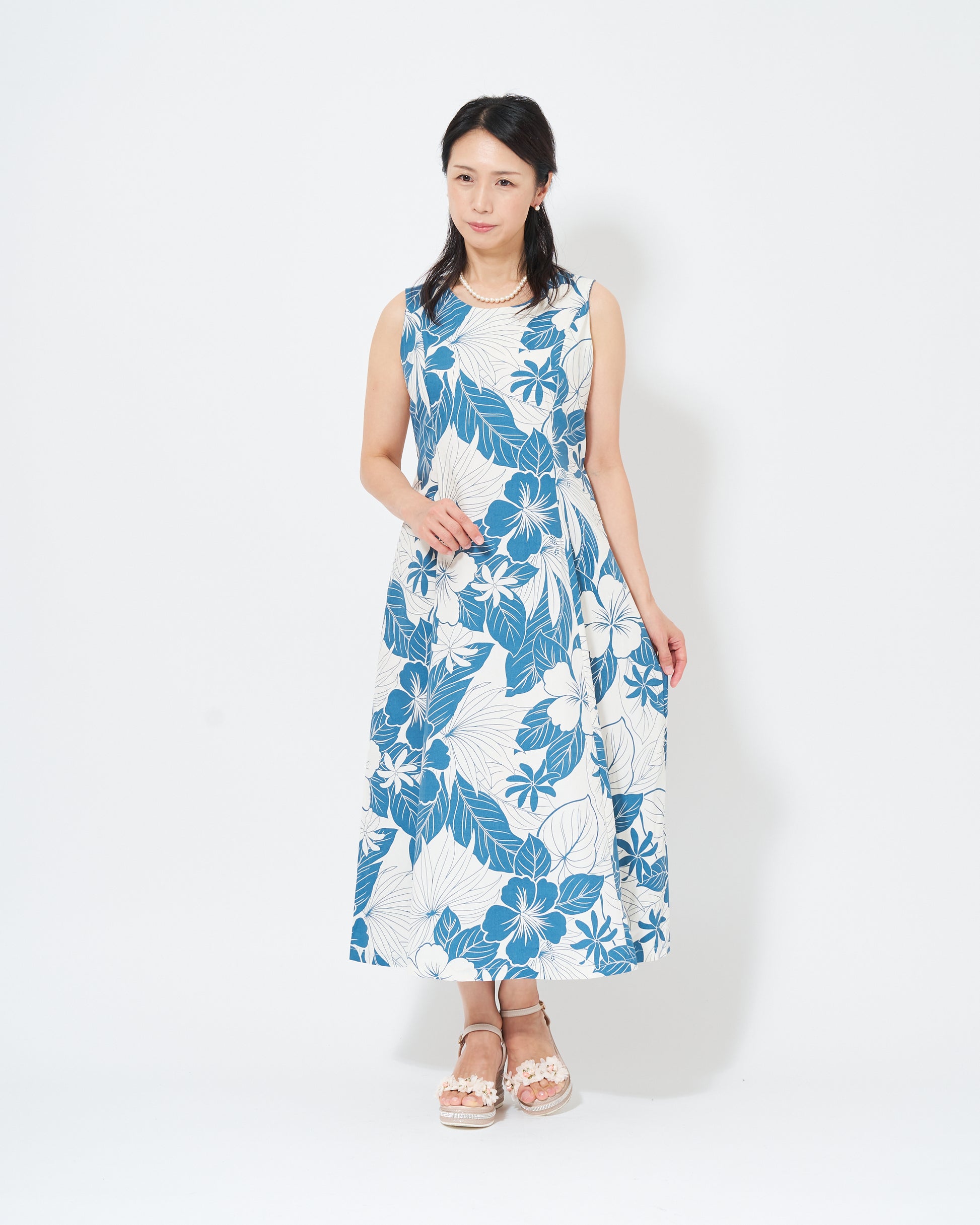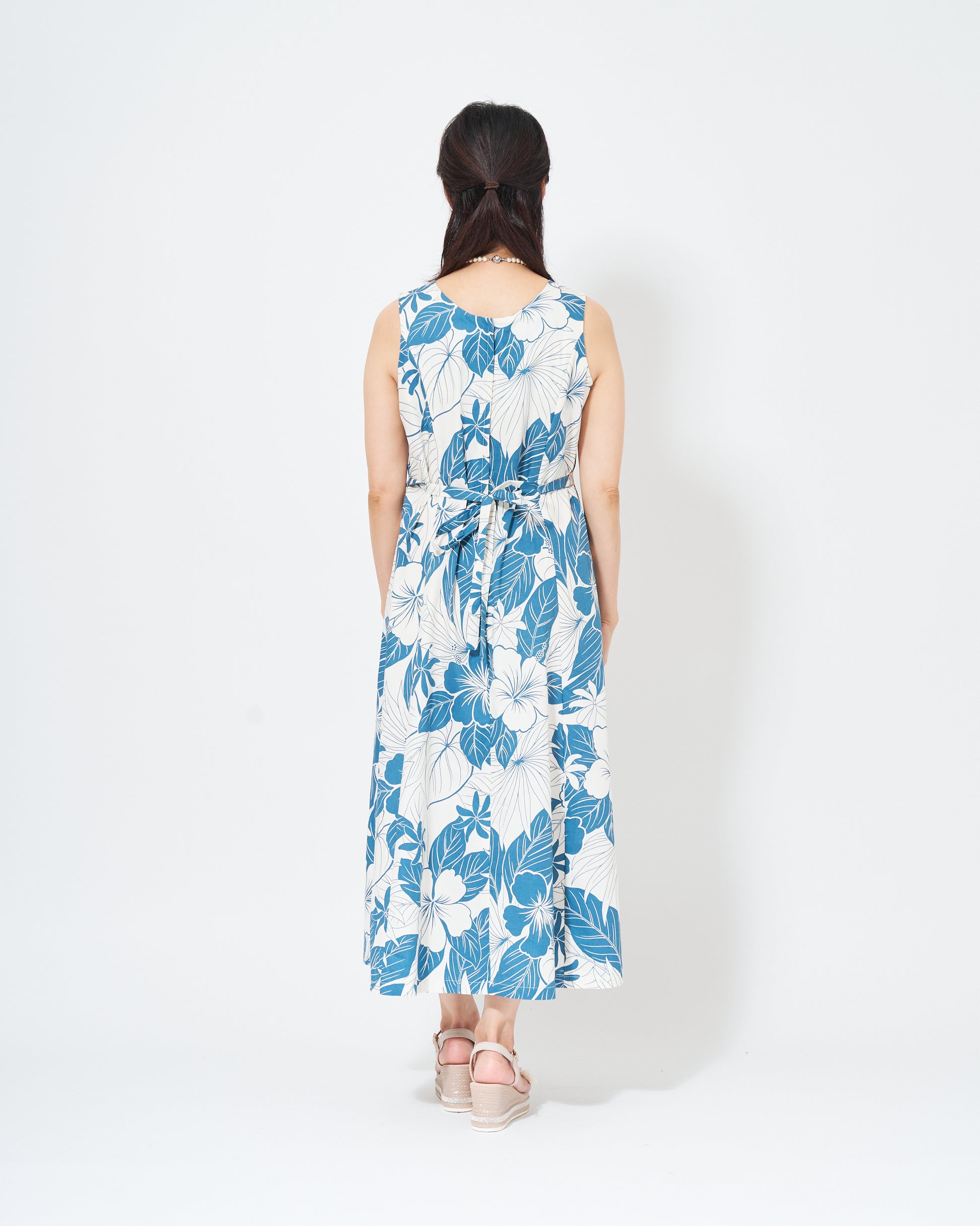 This sleeveless dress features Hawaiian motifs such as hibiscus flowers and taro printed in a calm blue color.