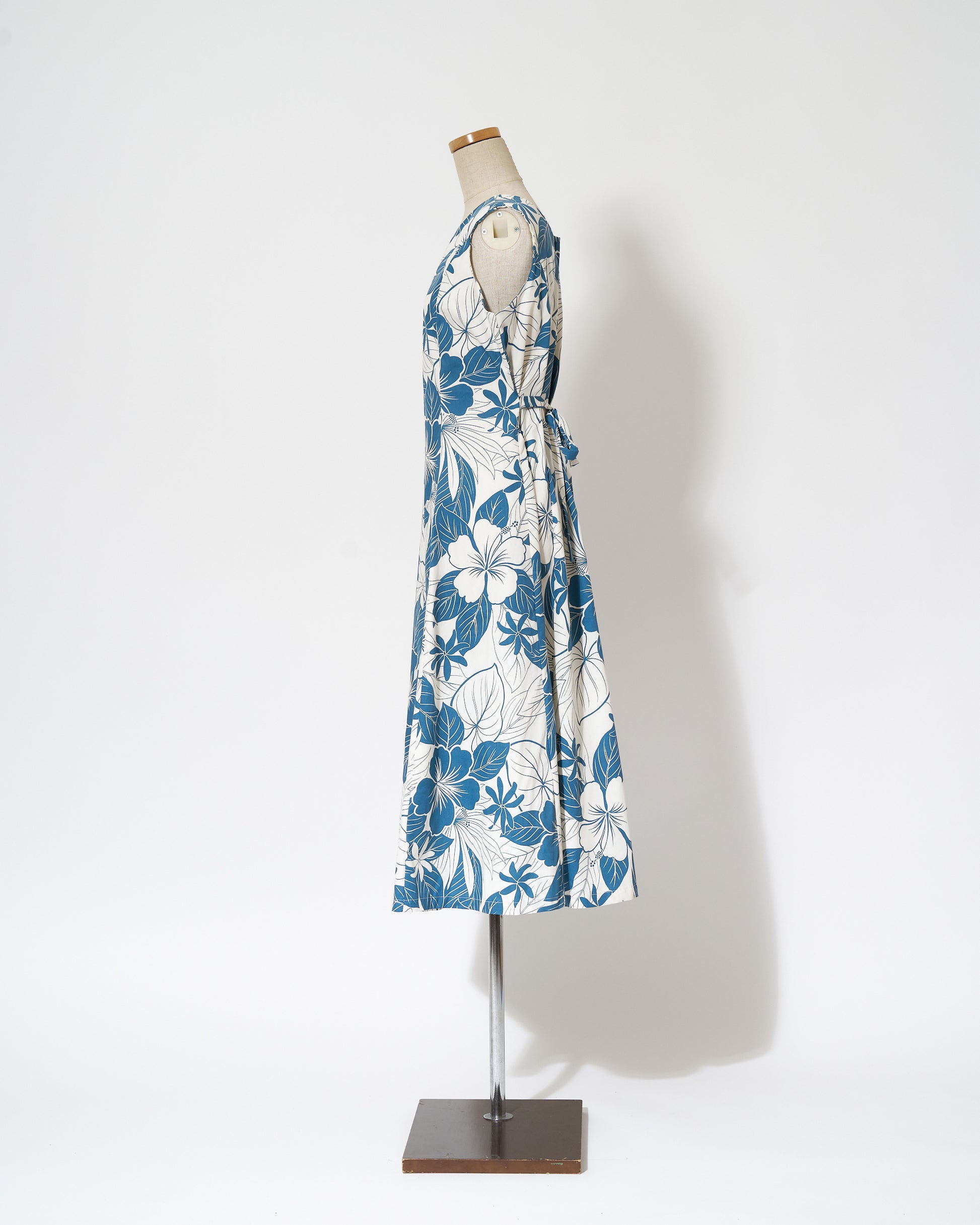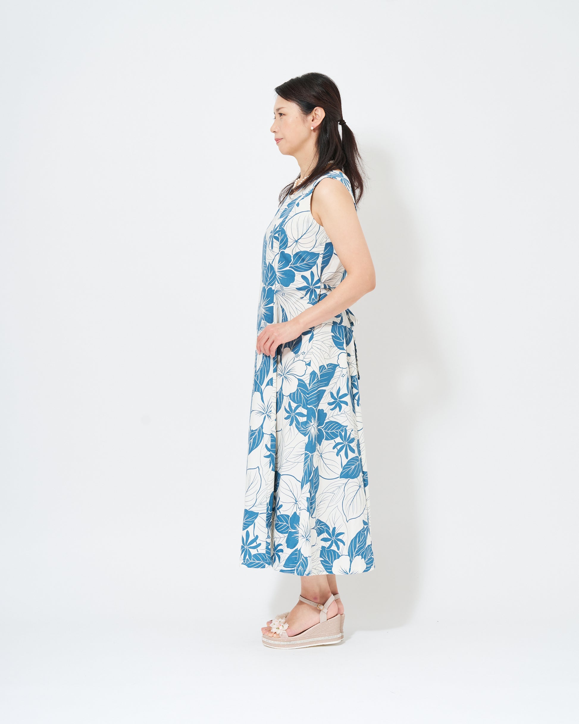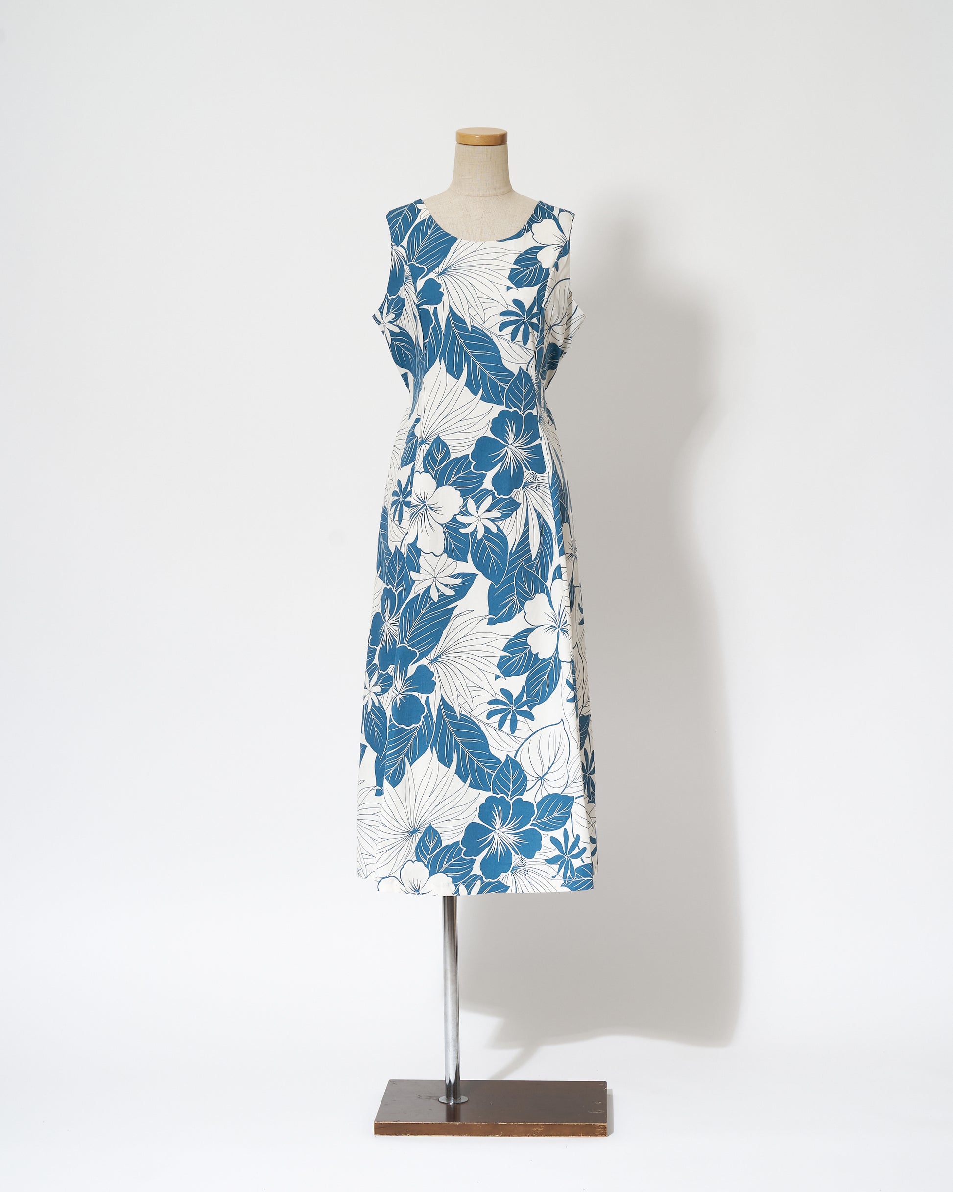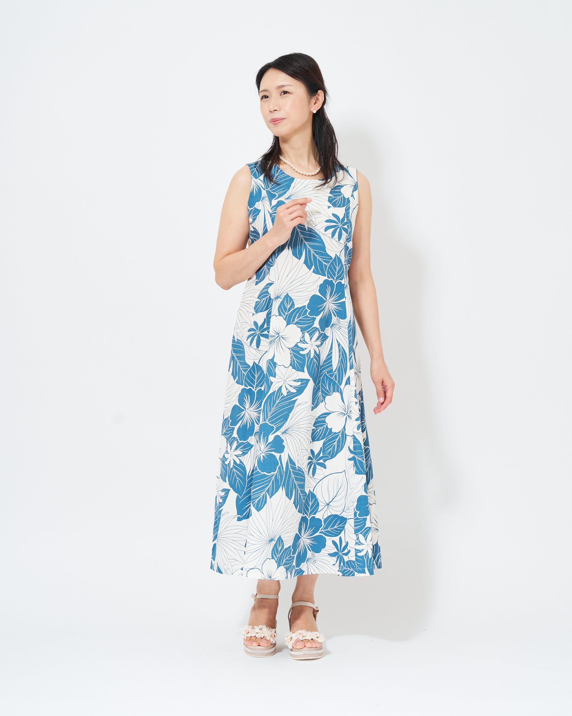 This sleeveless dress features Hawaiian motifs such as hibiscus flowers and taro printed in a calm blue color.