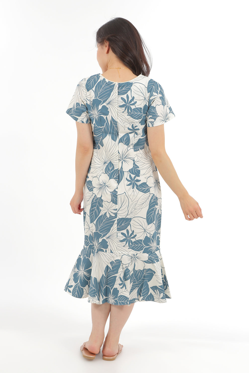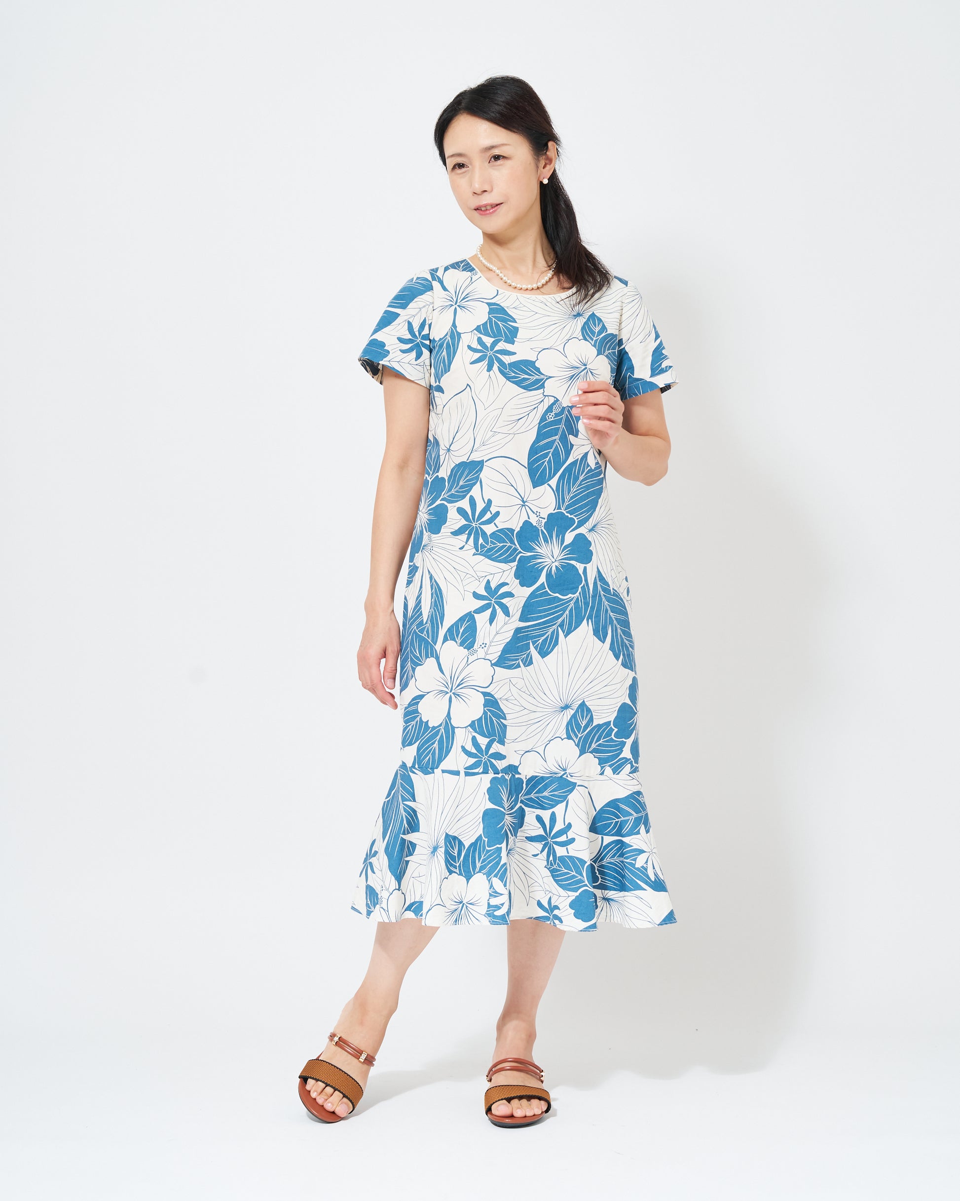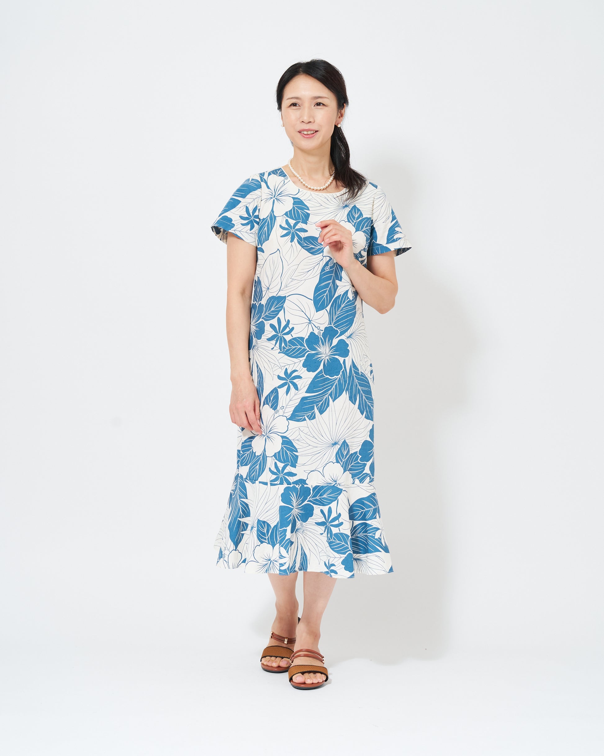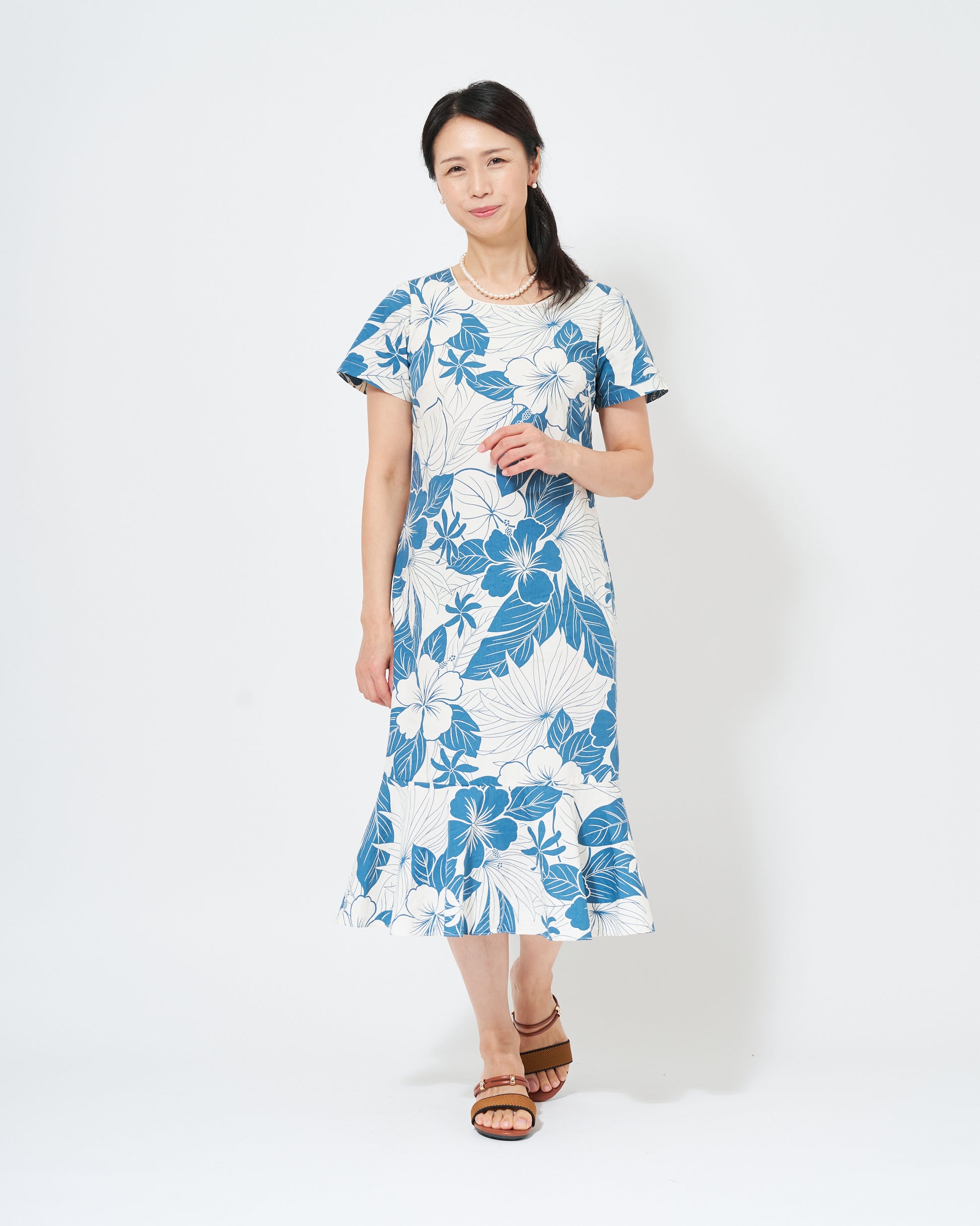 This mid-length dress has a very elegant flared hem. The hibiscus pattern in a calm blue color is perfect for a variety of resort-style parties! It has a zipper on the back, giving it a clean silhouette.