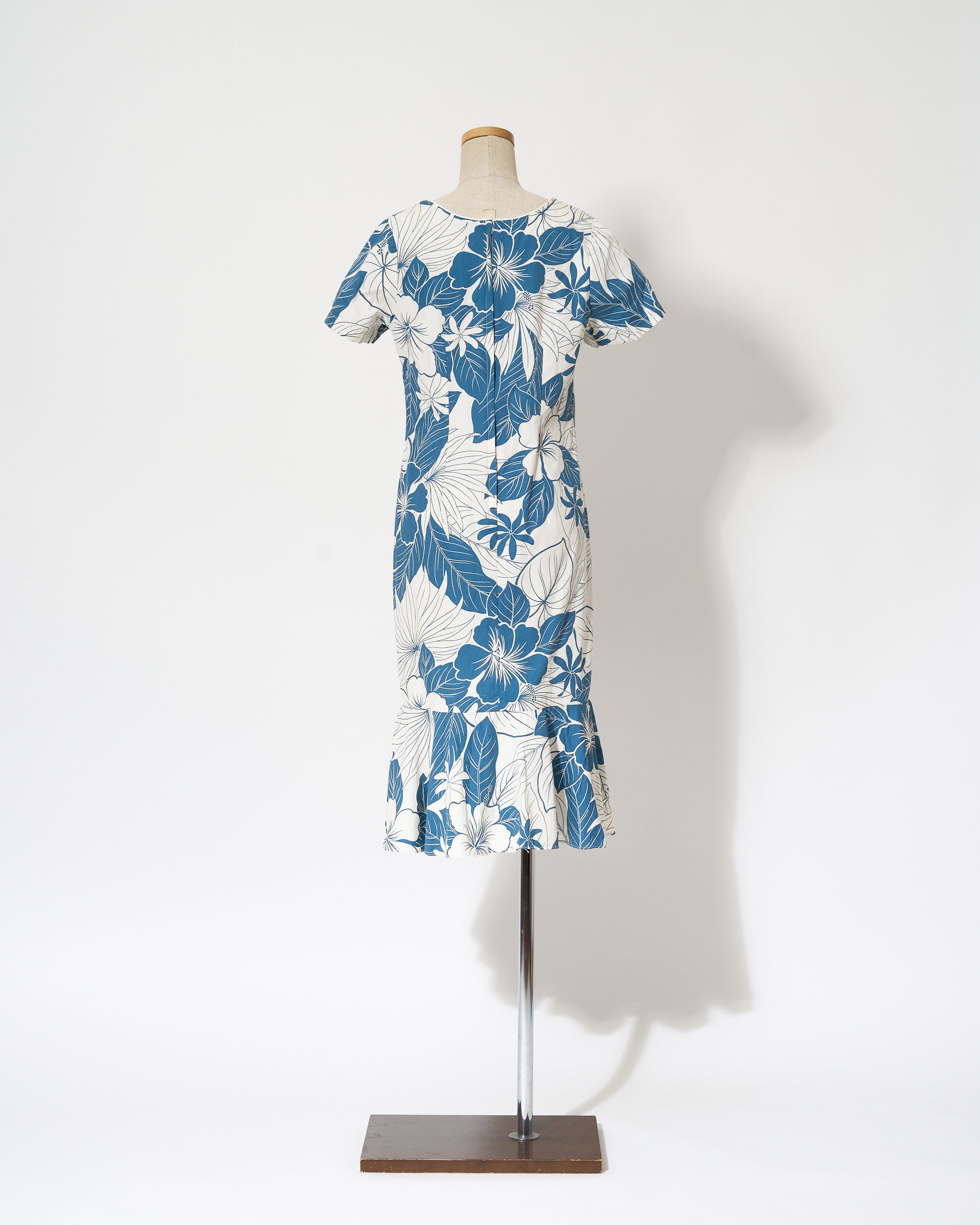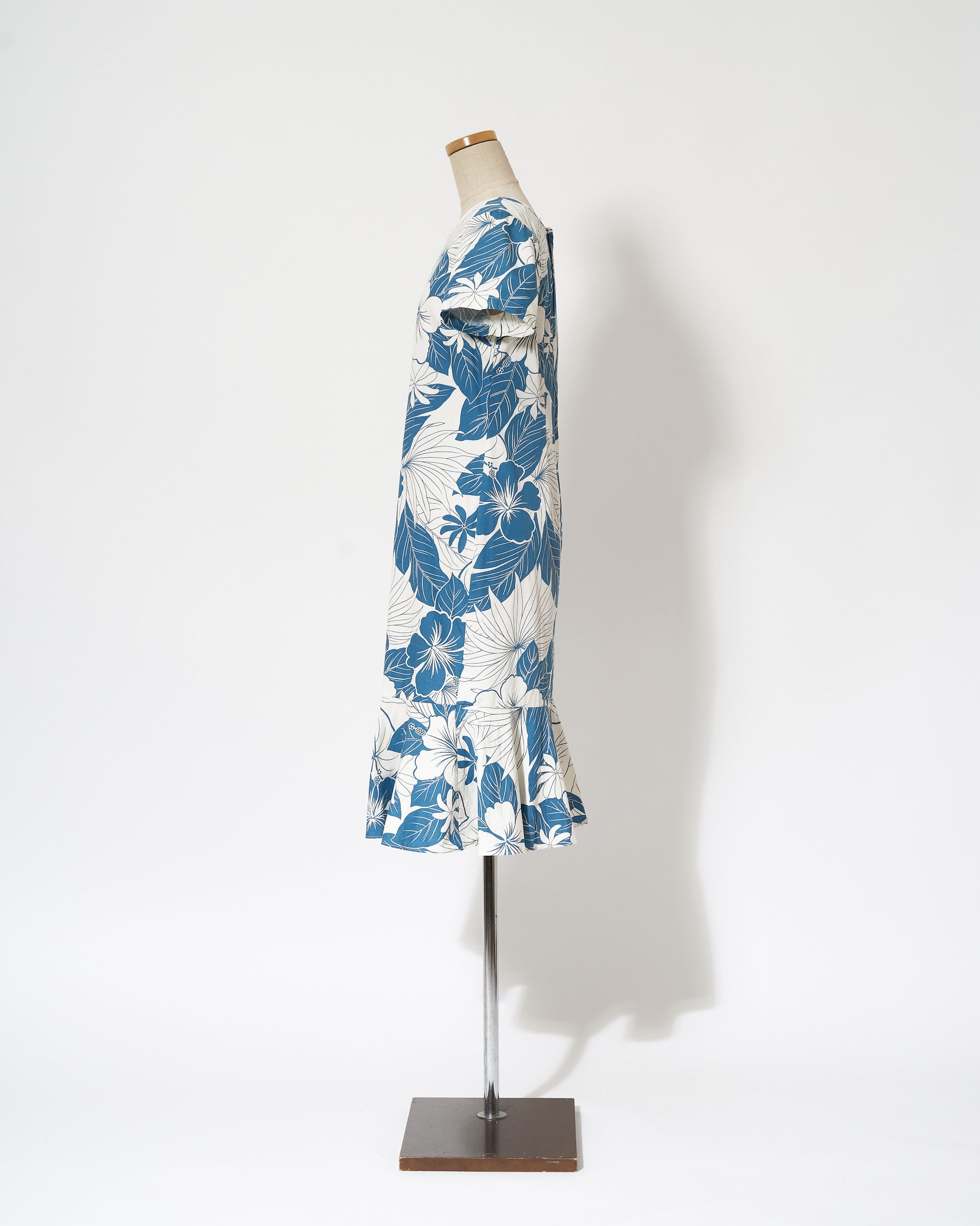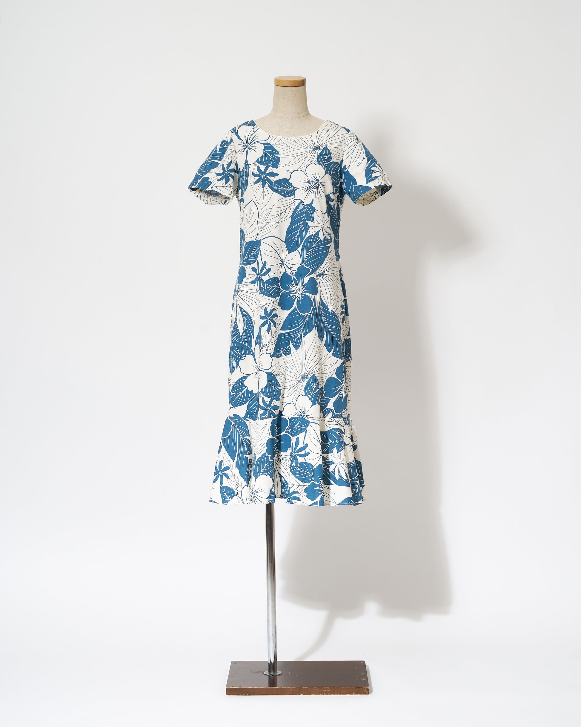 This mid-length dress has a very elegant flared hem. The hibiscus pattern in a calm blue color is perfect for a variety of resort-style parties! It has a zipper on the back, giving it a clean silhouette.