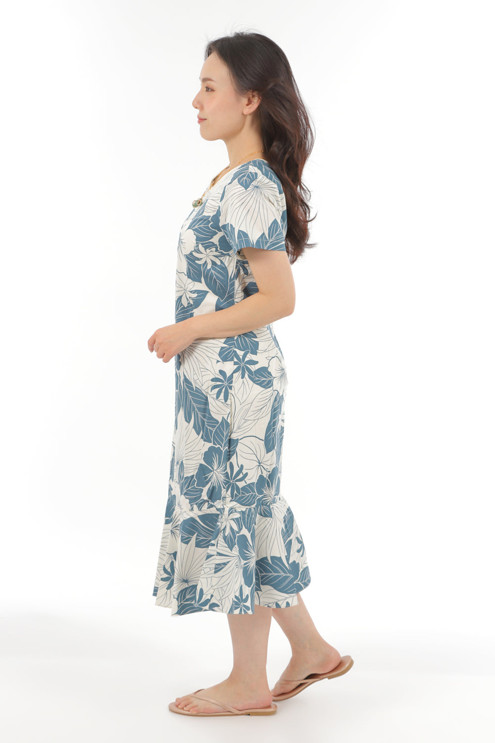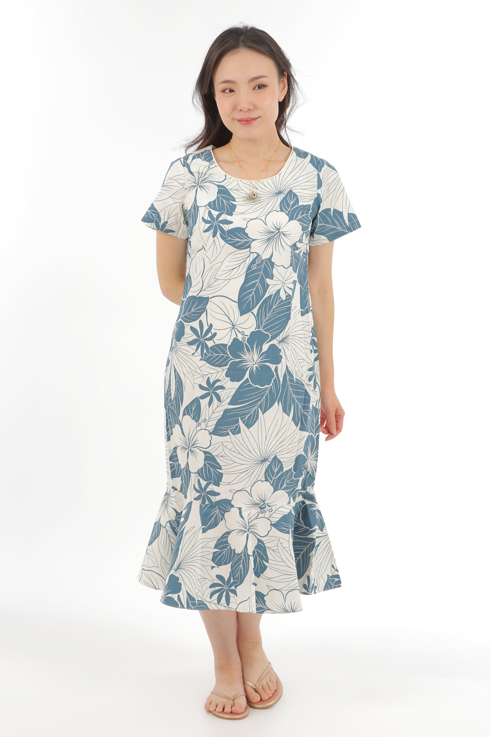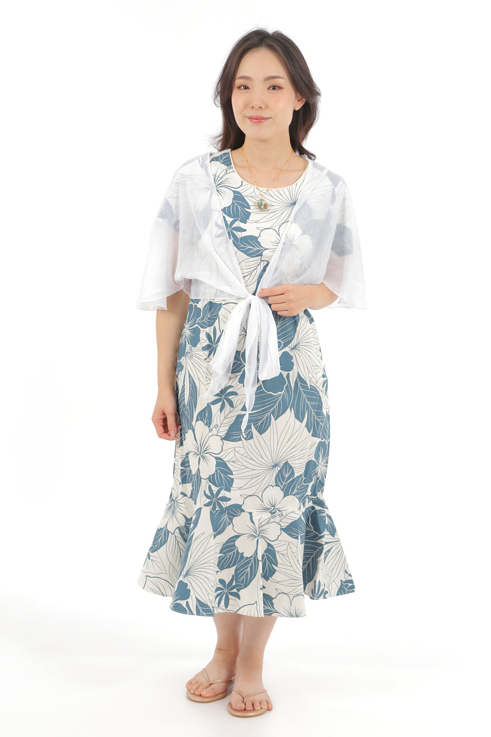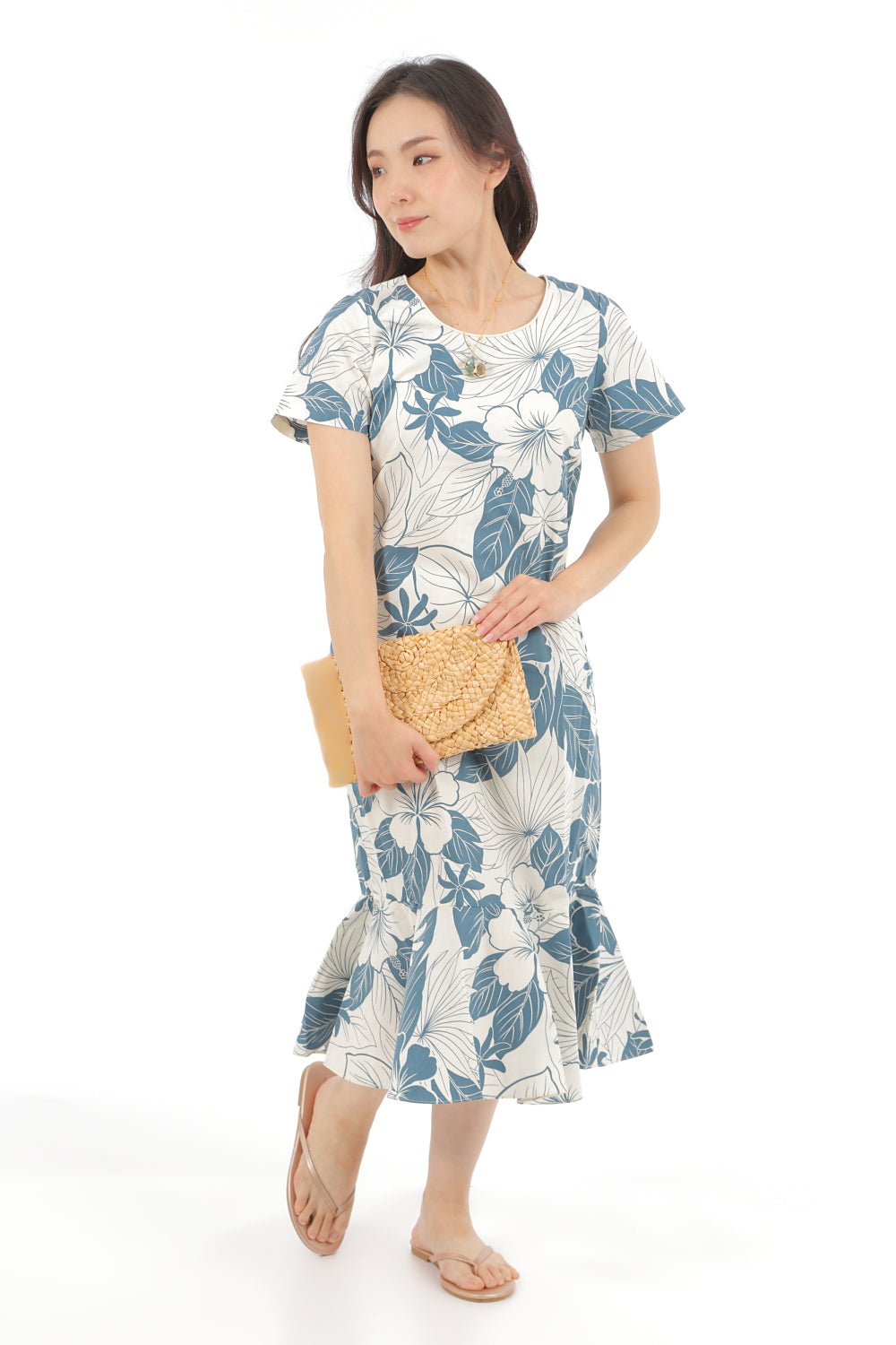 This mid-length dress has a very elegant flared hem. The hibiscus pattern in a calm blue color is perfect for a variety of resort-style parties! It has a zipper on the back, giving it a clean silhouette.