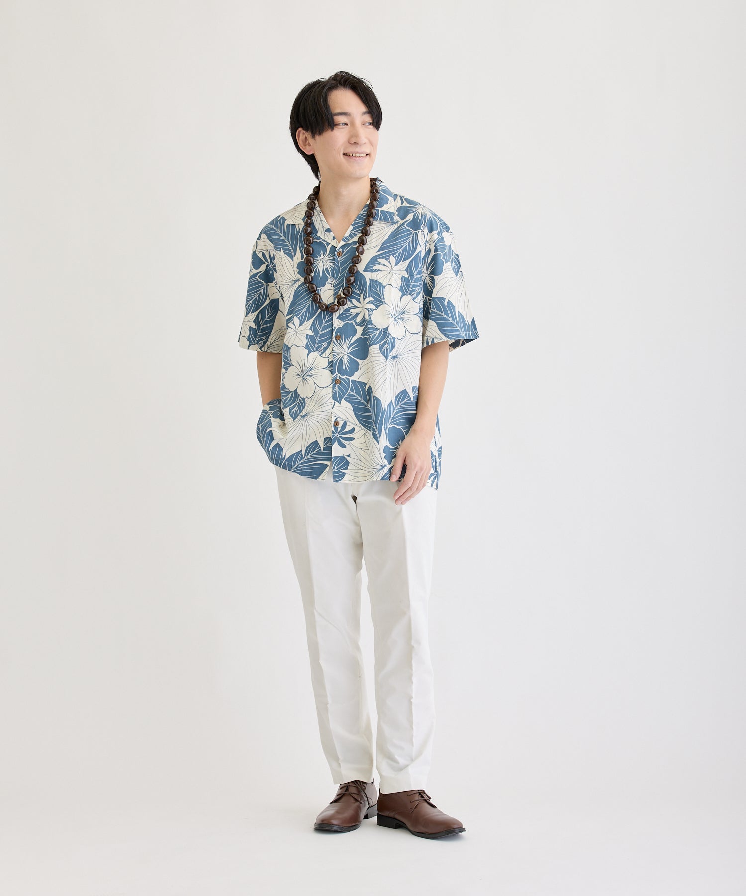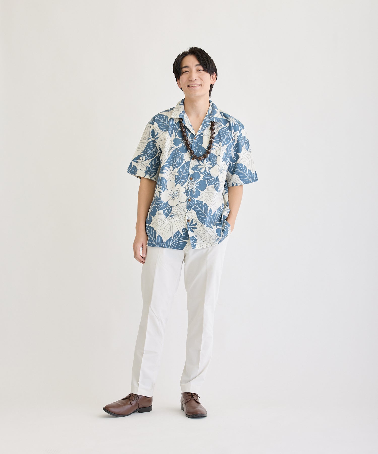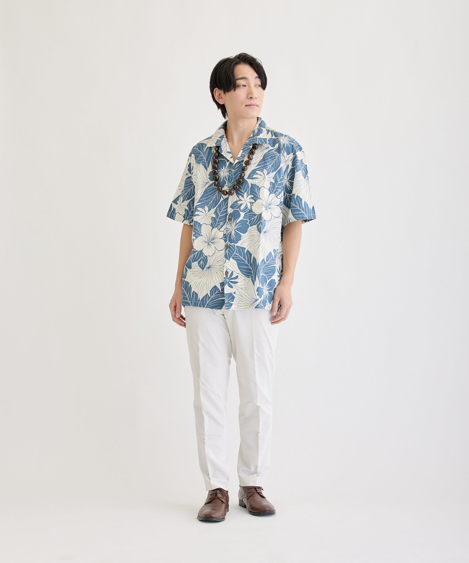 ハイビスカスフラワーやタロなどのハワイアンモチーフを、クールなブルーカラーでプリントしたアロハシャツです!
